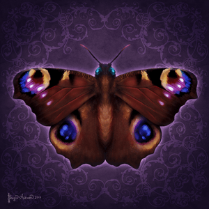 Behind the butterfly, the background holds steady. A deep violet field is patterned with an ornate damask motif, symmetrical and continuous. The pattern is slightly lighter than the base color, visible but never dominant. It frames the butterfly without enclosing it, allowing the central figure to remain visually separate. A soft lavender glow radiates outward from the wings, gently lifting the butterfly off the background and preventing the composition from flattening.