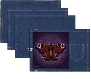 On white denim, contrast sharpens. The butterfly’s silhouette becomes crisp, and the warm browns and plums stand out clearly against the bright base. The eye spots read vividly, their blues and purples clean and luminous. The damask pattern becomes more legible, reinforcing structure and symmetry. Emotionally, the artwork feels refined and decorative, like a formal emblem or gallery print.