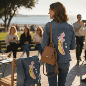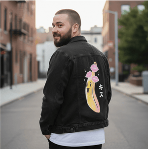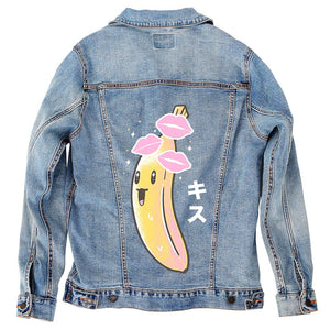 BANANA KISSES, by Tobe Fonesca digitally printed on a hand-made Denim Jacket with 3 color choices: Stonewash, White, or Black. Unisex XS S M L XL 2X 3X