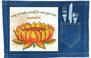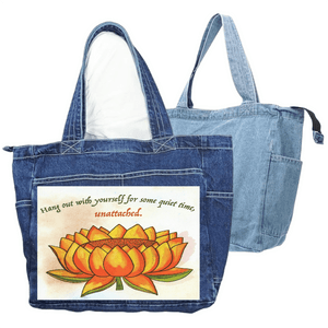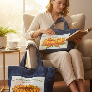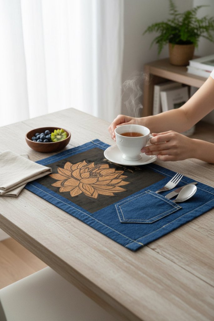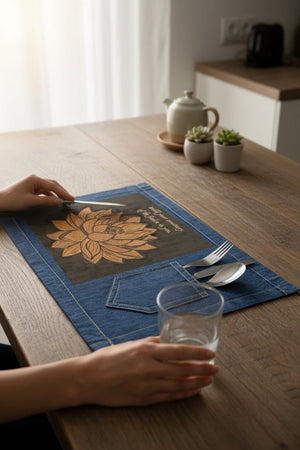 On black denim, the artwork becomes intimate and quiet. Much of the background pattern merges into the base, while the cream center and gold leaves emerge as focal points. The text feels closer, almost whispered. As the fabric folds, parts of the lotus pattern reappear and disappear, reinforcing the sensation of movement within closeness.
