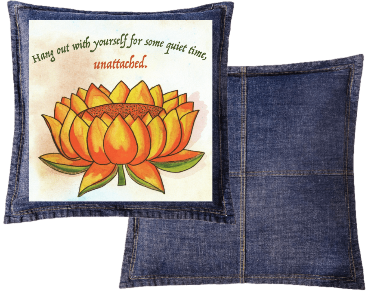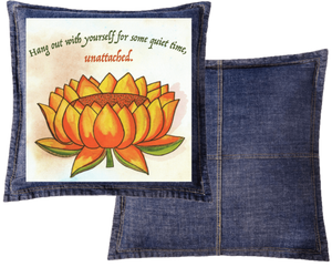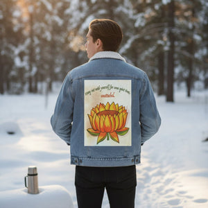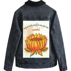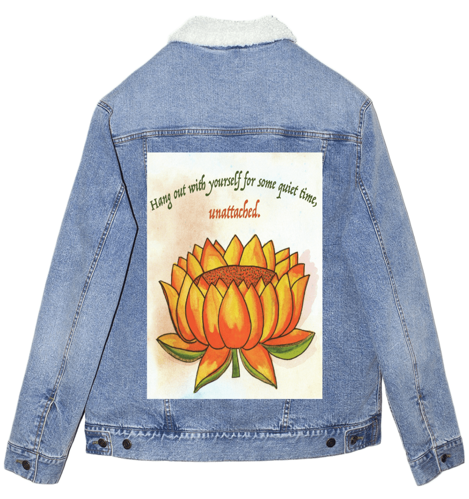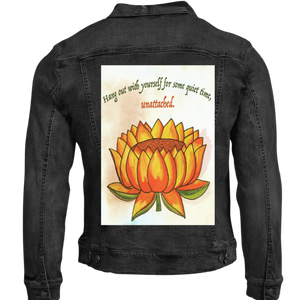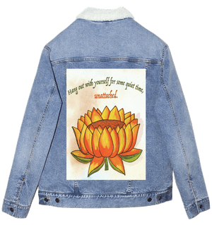 On stonewashed denim, the black background softens into charcoal and smoke. The repeating lotus shapes blur slightly into one another, becoming more atmospheric and less rigid. The cream center warms and spreads gently, and the gold stems mellow into soft highlights embedded in cloth. The emotional tone shifts toward compassion — self-embrace as something practiced over time.