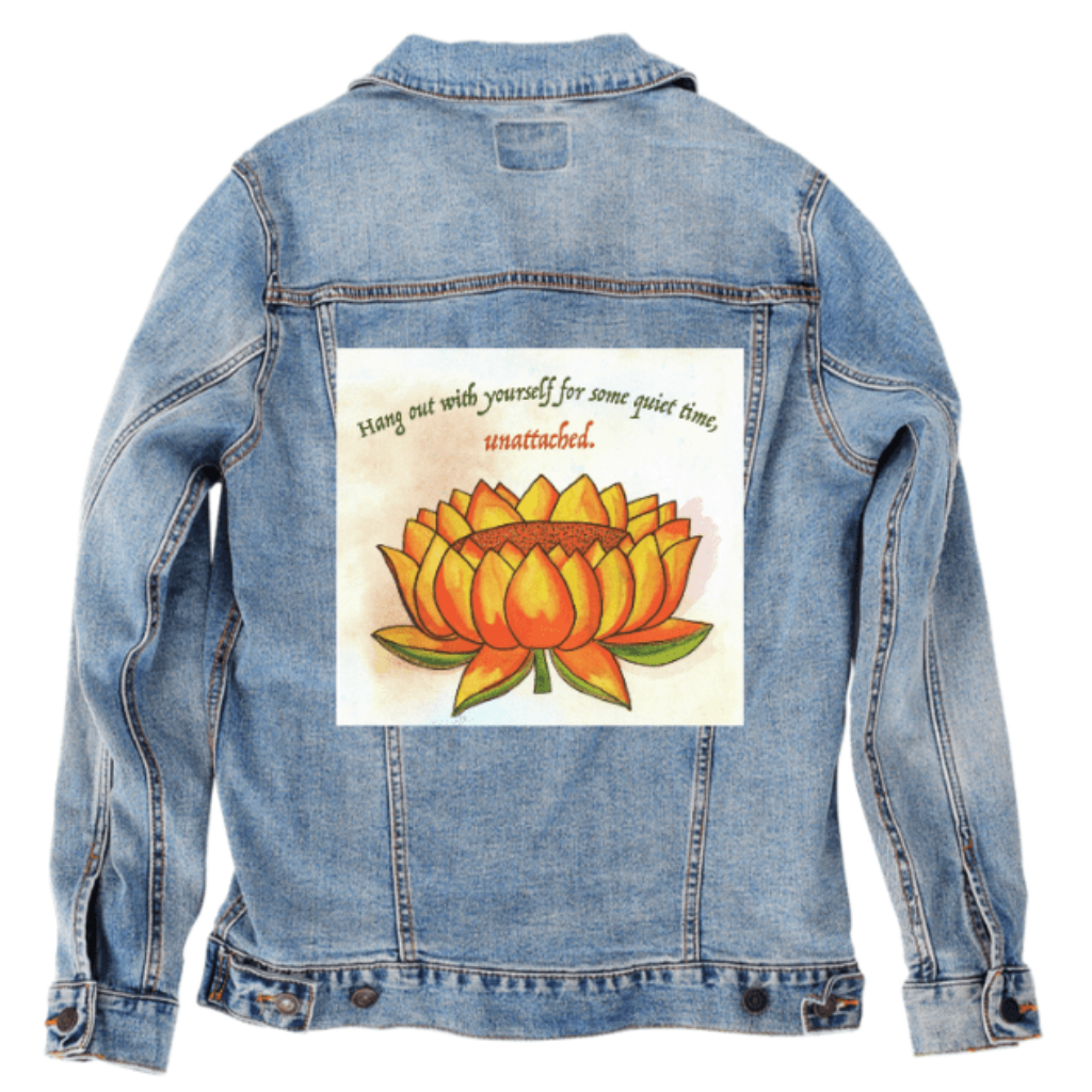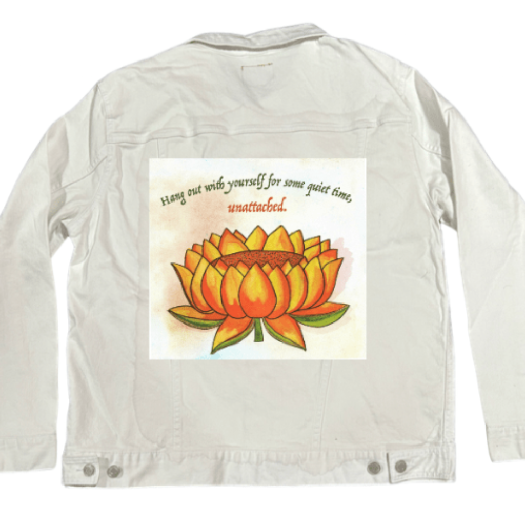 On white denim, clarity takes hold. The contrast between dark pattern and light center sharpens, and the text becomes immediately legible from a distance. The lotus shapes read more distinctly as individual forms, emphasizing the idea of many presences sharing space. The gold accents appear crisp and intentional. This clarity matters because it frames the message as an active choice rather than a reflection.