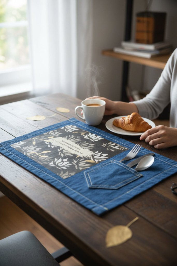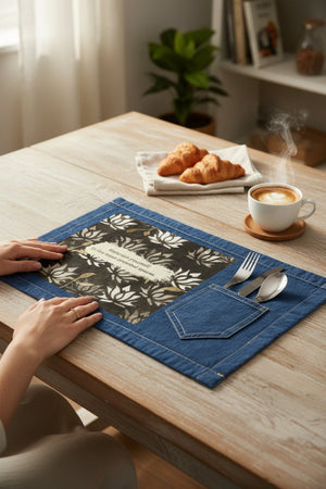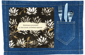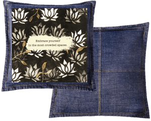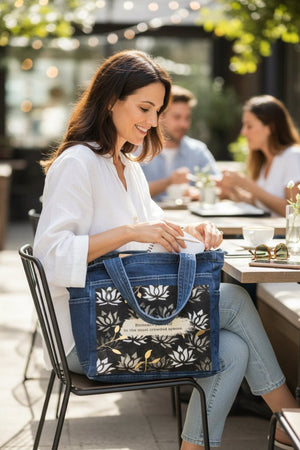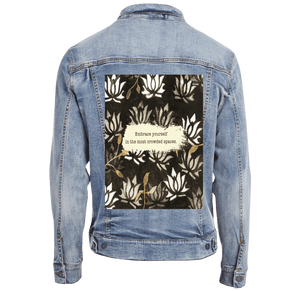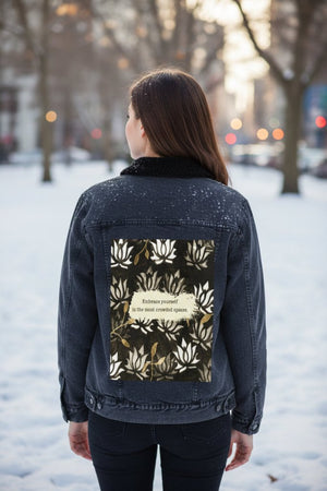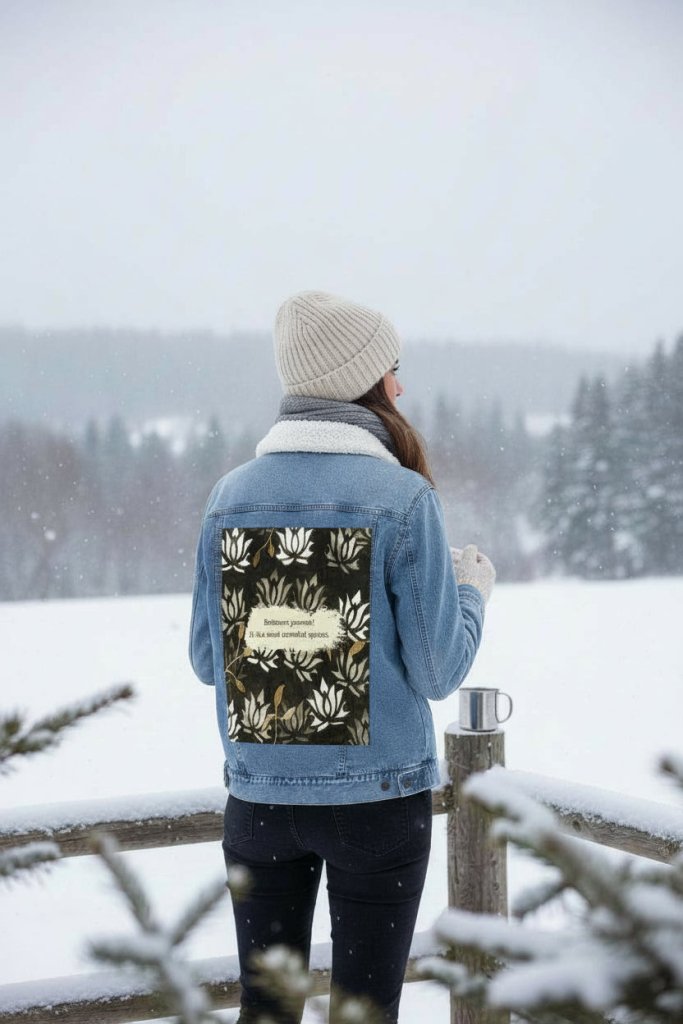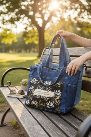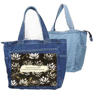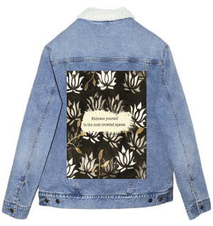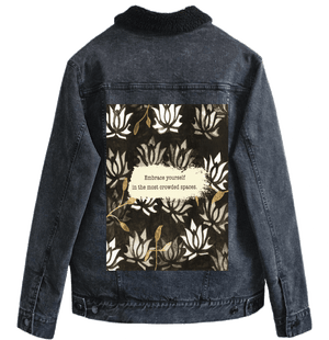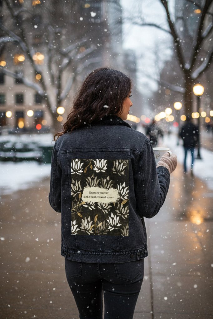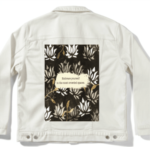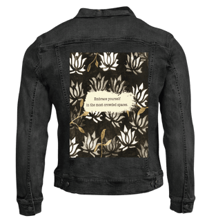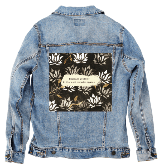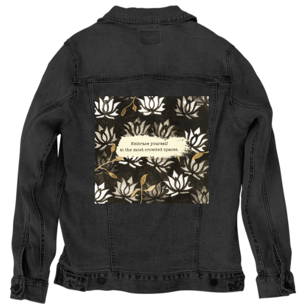 On black denim, the background nearly merges with the base, allowing the cream center and gold leaves to emerge with intimacy. The text feels closer, quieter, almost whispered. As the fabric moves, parts of the lotus pattern surface and recede, mirroring the experience of moving through crowded spaces while holding your center.