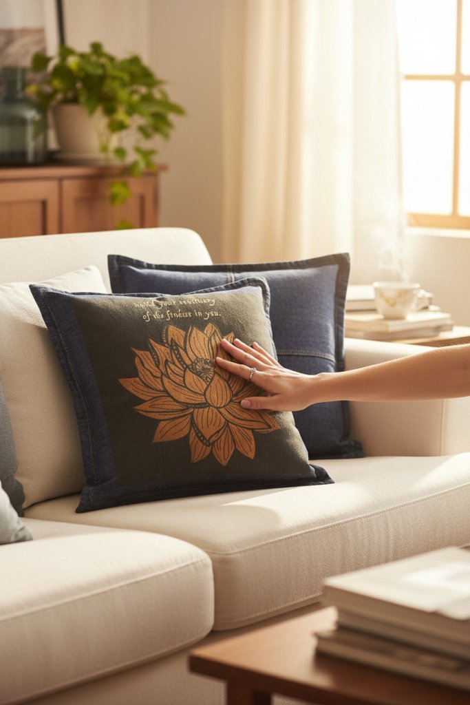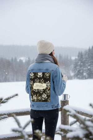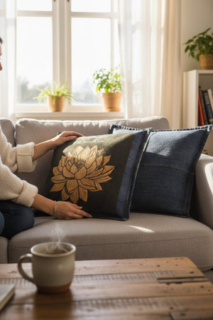 On stonewashed denim, the blacks soften into smoke and ash. The lotus pattern blurs slightly, becoming more atmospheric, while the cream center warms and spreads gently. The gold stems mellow into subtle highlights embedded in cloth. The emotional tone shifts toward compassion and endurance — self-embrace practiced over time.