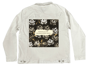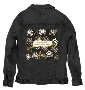 BE YOURSELF by CANVAS and QUOTATIONS, digitally printed on a hand-made Denim Jacket with 3 color choices: Stonewash, White, or Black. Unisex XS S M L XL 2X 3X.