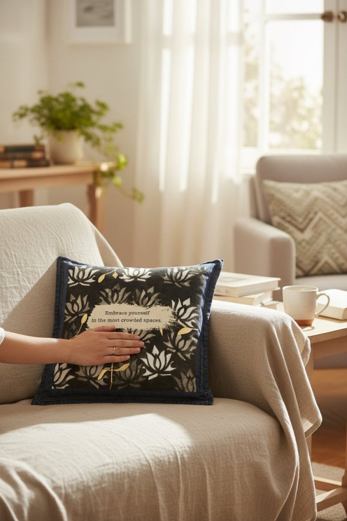 A dark charcoal and black patterned background filled with repeating lotus-like floral silhouettes. at the center is an irregular cream-colored painted rectangle with rough brush edges containing black serif text that reads “Embrace yourself in the most crowded spaces.” Delicate gold botanical stems with small leaves overlay parts of the composition diagonally. This artwork is titled “Be Yourself” and created by Canvas & Quotations (Monika Chugh and Alka Chopra)