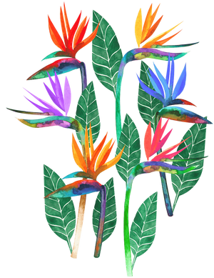 Multiple bird of paradise flowers with elongated curved stems and sharp, pointed petals in saturated watercolor hues. Orange and yellow petals radiate upward, while others shift into red, magenta, violet, and cobalt blue. Broad green leaves with white central veins fan outward around each stem. Pigment pooling and translucent washes create layered color transitions and visible brush textures against a transparent background. This artwork is titled “Bird of Paradise 1” and created by Hend Shehata