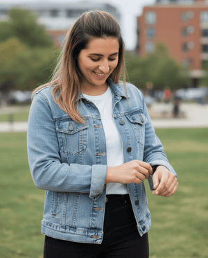 Classic blue denim gives the piece a timeless quality. The flowers feel neither softened into memory nor sharpened into declaration, but held in a natural, wearable presence. The artwork feels fully at home, as if it belongs there.