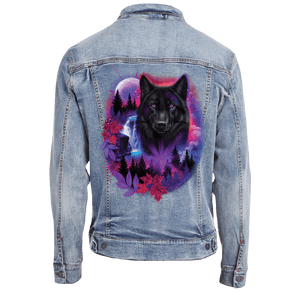 On black denim, Black Wolf Spirit feels secretive and powerful — a vision held close, where the wolf is not displayed but encountered, emerging from shadow with quiet authority and unwavering calm.