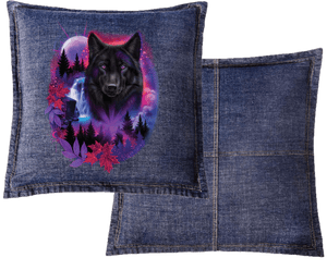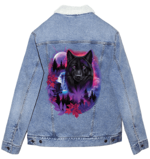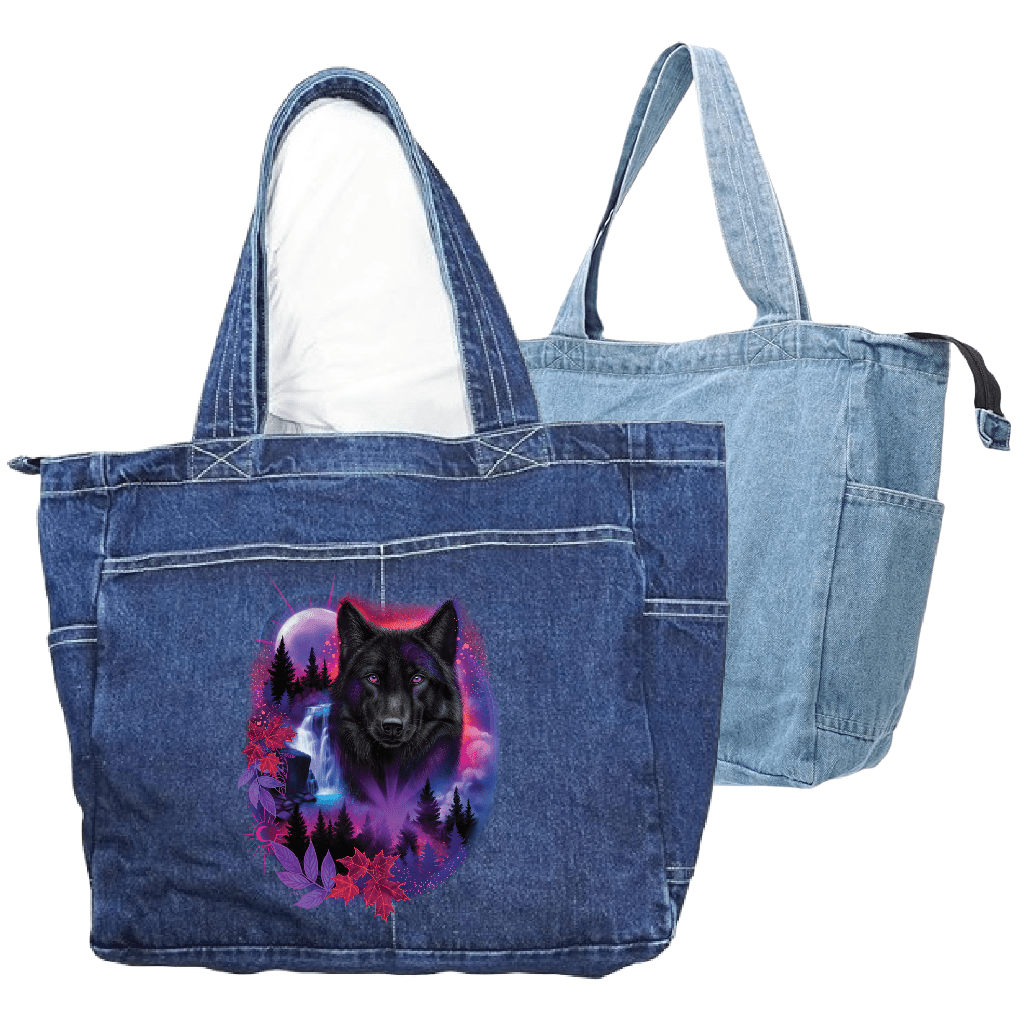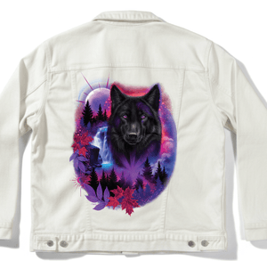 On stonewashed denim, the entire image softens into something ancient and familiar. The wolf’s black fur absorbs into the worn twill, muting sharp highlights and blending violet undertones into the fabric’s grain. The glowing eyes become gentler, less piercing, more watchful than intense.