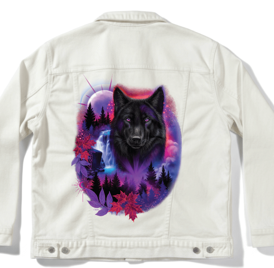 On black denim, the scene becomes intimate and cinematic. The wolf’s fur merges subtly with the fabric, causing the eyes, moon, and waterfall to glow forward dramatically. Purple and magenta mist intensifies, feeling thicker and closer.