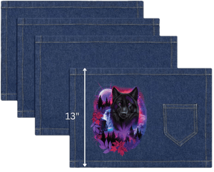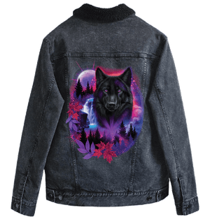 Stonewashed denim makes Black Wolf Spirit feel like a companion image. The scene feels lived-with, protective, and calm, as though the wolf has been there a long time.