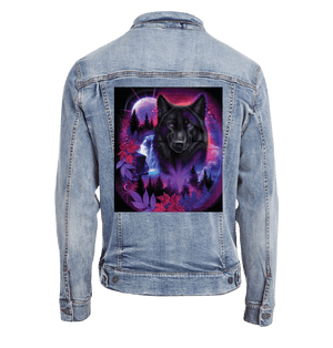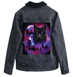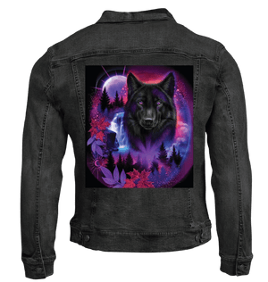 On black denim, Black Wolf Spirit with background feels secretive and powerful — a vision held close, where the wolf is not displayed but encountered, emerging from shadow with quiet authority and unwavering calm.