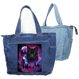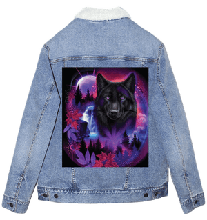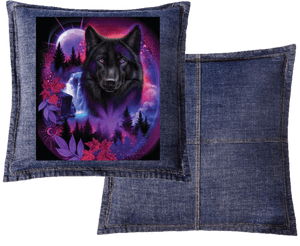 On stonewashed denim, the entire image softens into something ancient and familiar. The wolf’s black fur absorbs into the worn twill, muting sharp highlights and blending violet undertones into the fabric’s grain. The glowing eyes become gentler, less piercing, more watchful than intense.