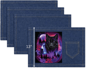 Stonewashed denim makes Black Wolf Spirit with background feel like a companion image. The scene feels lived-with, protective, and calm, as though the wolf has been there a long time.