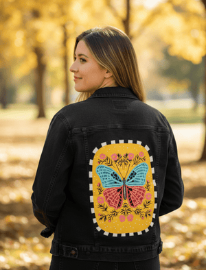 BLOOM and FLUTTER by INDYSIGN, digitally printed on a hand-made Denim Jacket with 3 color choices: Stonewash, White, or Black. Unisex XS S M L XL 2X 3X