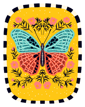 A stylized butterfly centered on a bright yellow background framed by a rounded black-and-white striped border. The butterfly has teal upper wings and coral-red lower wings filled with dotted patterns, with a dark body marked by white dots. Pink flowers with dark stems and leaves surround the butterfly in a symmetrical arrangement, with small white dots scattered across the background. This artwork is titled “Bloom & Flutter Butterfly” and created by INDYSIGN
