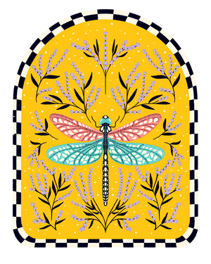 A stylized dragonfly centered on a bright yellow background framed by a rounded black-and-white checkered border. The dragonfly has coral-pink upper wings and teal lower wings filled with dotted patterns, a dark segmented body with white dots, and small antennae. Lavender flowers with dark stems and leaves surround the dragonfly in a symmetrical arrangement, with small white dots scattered across the background. This artwork is titled “Bloom & Flutter Dragonfly” and created by INDYSIGN