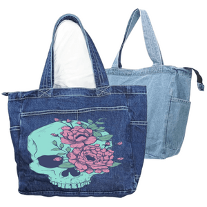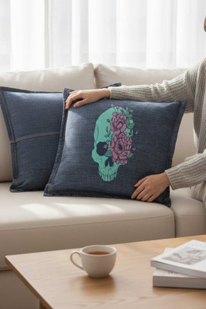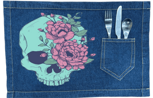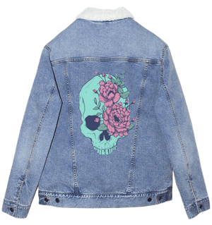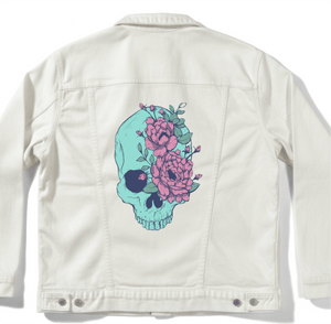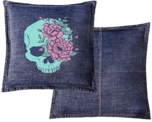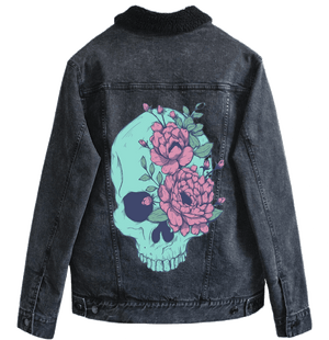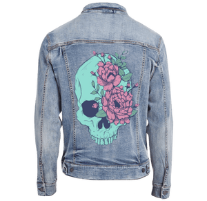 stonewashed denim, the turquoise skull softens immediately. Pigment sinks into
