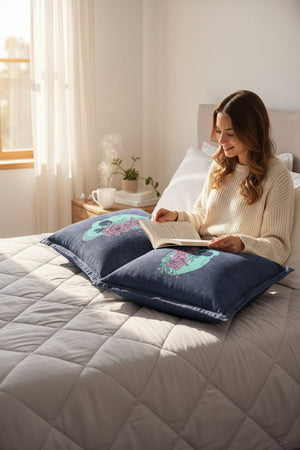 pink flowers on black denim deepen in tone, their edges glowing subtly where