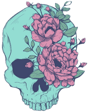 pink peony-like flowers bloom from the top and right side of the skull, their