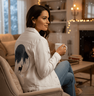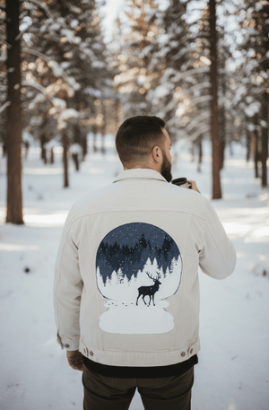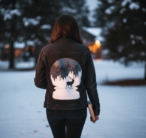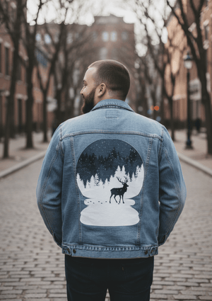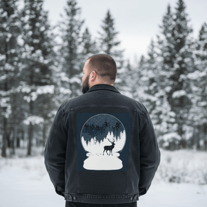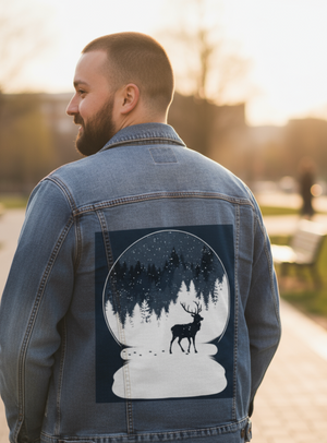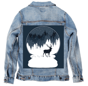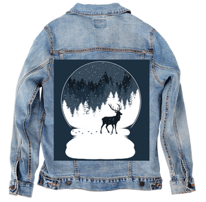 BOULE à NEIGE, by Tobe Fonseca, digitally printed on a hand-made Denim Jacket with 3 color choices: Stonewash, White, or Black. Unisex XS S M L XL 2X 3X