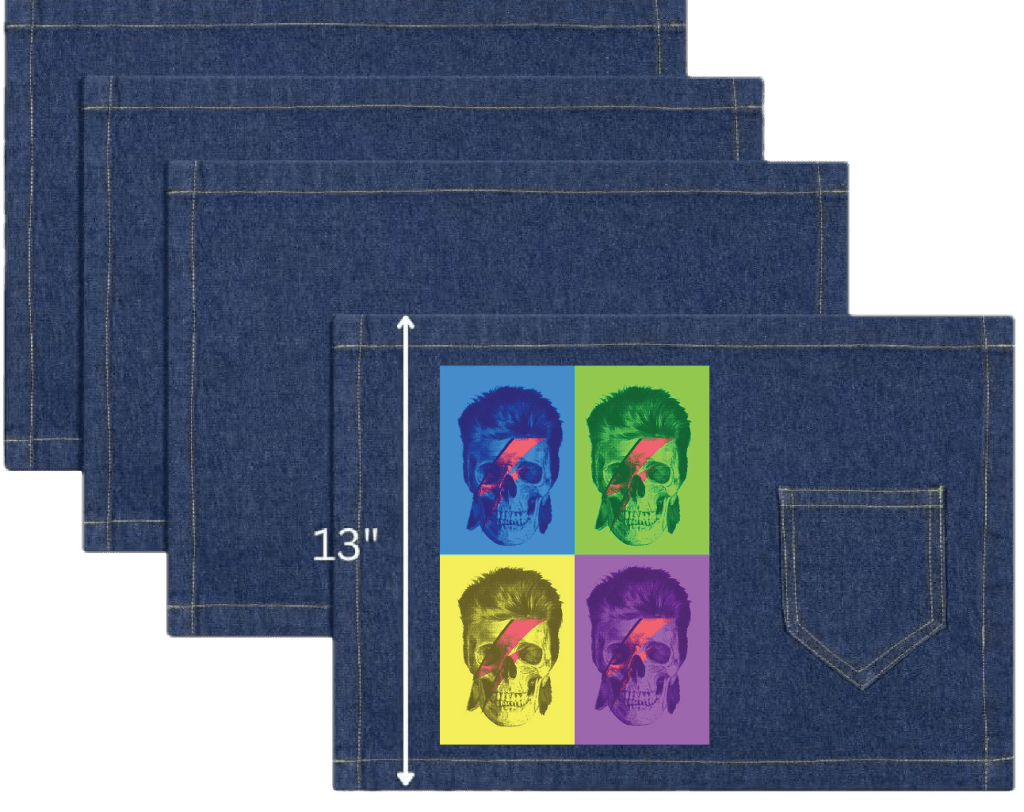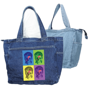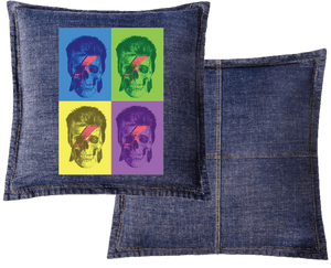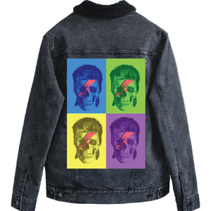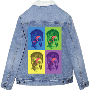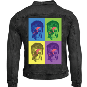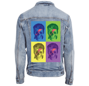 Classic blue denim gives Bowie Pop Art longevity, preserving its repetition, color play, and graphic identity while allowing it to live naturally on the garment over time.