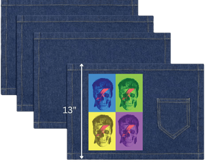 On white denim, clarity is at its peak. Each panel’s background color appears bold and clean, and the skull details — teeth, eye sockets, and hairline — read sharply. The lightning bolt becomes a strong focal line in every quadrant.