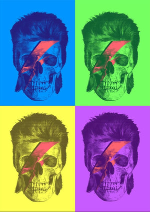 A skull with a stylized swept-back hairstyle and a diagonal lightning bolt across the face, presented in a four-panel grid. Each panel shows the same skull rendered in different color schemes: blue, green, yellow, and purple backgrounds with contrasting tinted skulls. The lightning bolt is bold and angular, cutting from the forehead down across one eye socket. This artwork is titled “Bowie Pop Art” and created by Grant Shepley