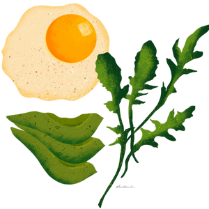 Texture carries the mood. Grain and speckle appear across egg, avocado, and greens alike, unifying disparate foods into a single visual language. There is no plate, no table, no context beyond form and color. The scene feels casual but deliberate, like ingredients paused mid-preparation, held together by restraint.