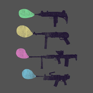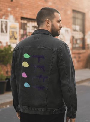 On black denim, the image becomes subtle and striking. The gun silhouettes merge closely with the fabric, receding into shadow. The pastel bubbles float forward, becoming the primary focal points. Color leads the eye instead of form.