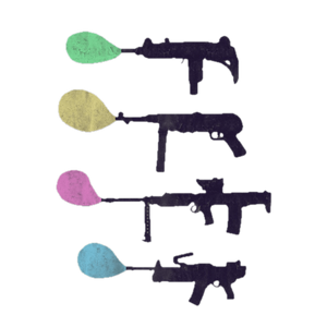 Then the contrast asserts itself at the barrel. From each gun extends a rounded, balloon-like shape, soft and imperfect. These forms read immediately as bubble gum, swollen and organic where the guns are rigid and mechanical. Each bubble differs only by color—muted green at the top, pale yellow beneath it, followed by pink, and finally light blue at the bottom—creating a gentle vertical gradient through the stack.