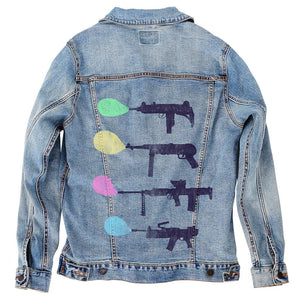 On white denim, clarity takes hold. The gun silhouettes become stark and graphic, their shapes immediately legible. The pastel bubbles pop cleanly against the white base, their colors crisp and intentional. The contrast between mechanical form and playful color is at its sharpest.