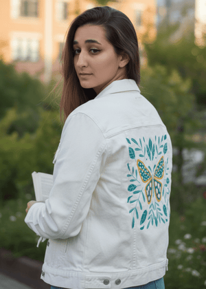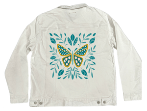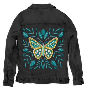 BUTTERFLY by HEND SHEHATA, digitally printed on a hand-made Denim Jacket with 3 color choices: Stonewash, White, or Black. Unisex XS S M L XL 2X 3X