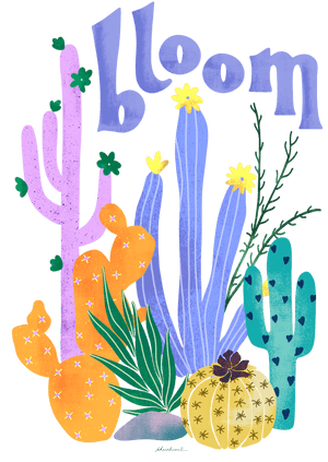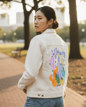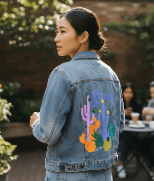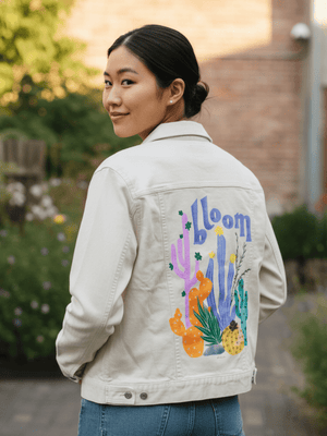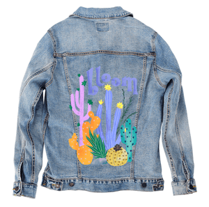 CACTUS BLOOMS by THEARTICSOUL, digitally printed on a hand-made Denim Jacket with 3 color choices: Stonewash, White, or Black. Unisex XS S M L XL 2X 3X