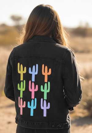CACTUS GARDEN by HEND SHEHATA, digitally printed on a hand-made Denim Jacket with 3 color choices: Stonewash, White, or Black. Unisex XS S M L XL 2X 3X