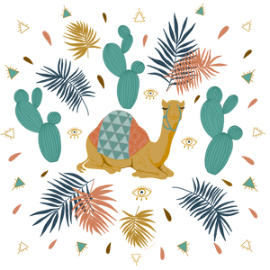 The balance between stillness and motion defines the piece. The camel remains steady and centered, while foliage and symbols orbit around it. Color relationships hold the harmony: teal and blue cooling the space, gold and coral warming it, all contained within clean shapes and deliberate spacing. The artwork feels contained, rhythmic, and quietly alert.