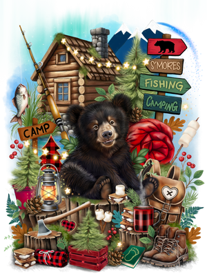 CAMPING COMPANION by SHEENA PIKE, digitally printed on a hand-made Denim Jacket with 3 color choices: Stonewash, White, or Black. Unisex XS S M L XL 2X 3X