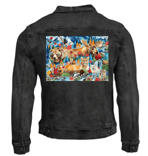 On black denim, the composition becomes cinematic and intimate. Darker animals — bear, moose, wolf — merge subtly with the fabric, allowing faces, eyes, and highlights to glow forward. The rivers and waterfalls become luminous threads of light cutting through shadow.