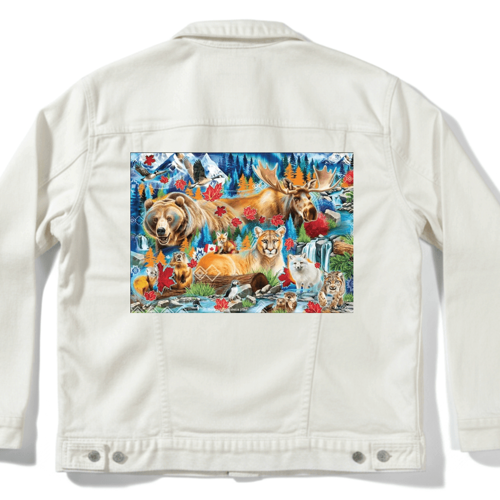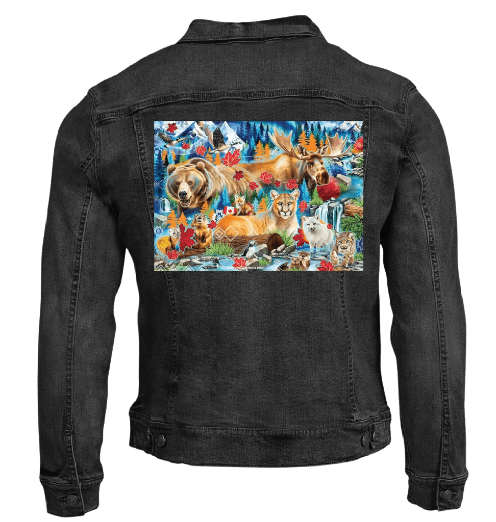 The red leaves intensify, floating like embers across the scene. Forests deepen into shadow, and the mountains feel farther and more mysterious. On black denim, Canadian Magic transforms into a quiet, powerful vision — the land alive in darkness, its inhabitants present, watchful, and deeply connected, held close rather than displayed.