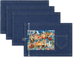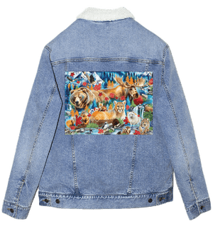On stonewashed denim, the entire scene softens into something timeless. The blues of water and forest diffuse into the worn twill, muting sharp contrasts and blending transitions between animals and landscape. The red maple leaves deepen into darker, earthier tones, embedding themselves into the fabric’s texture.