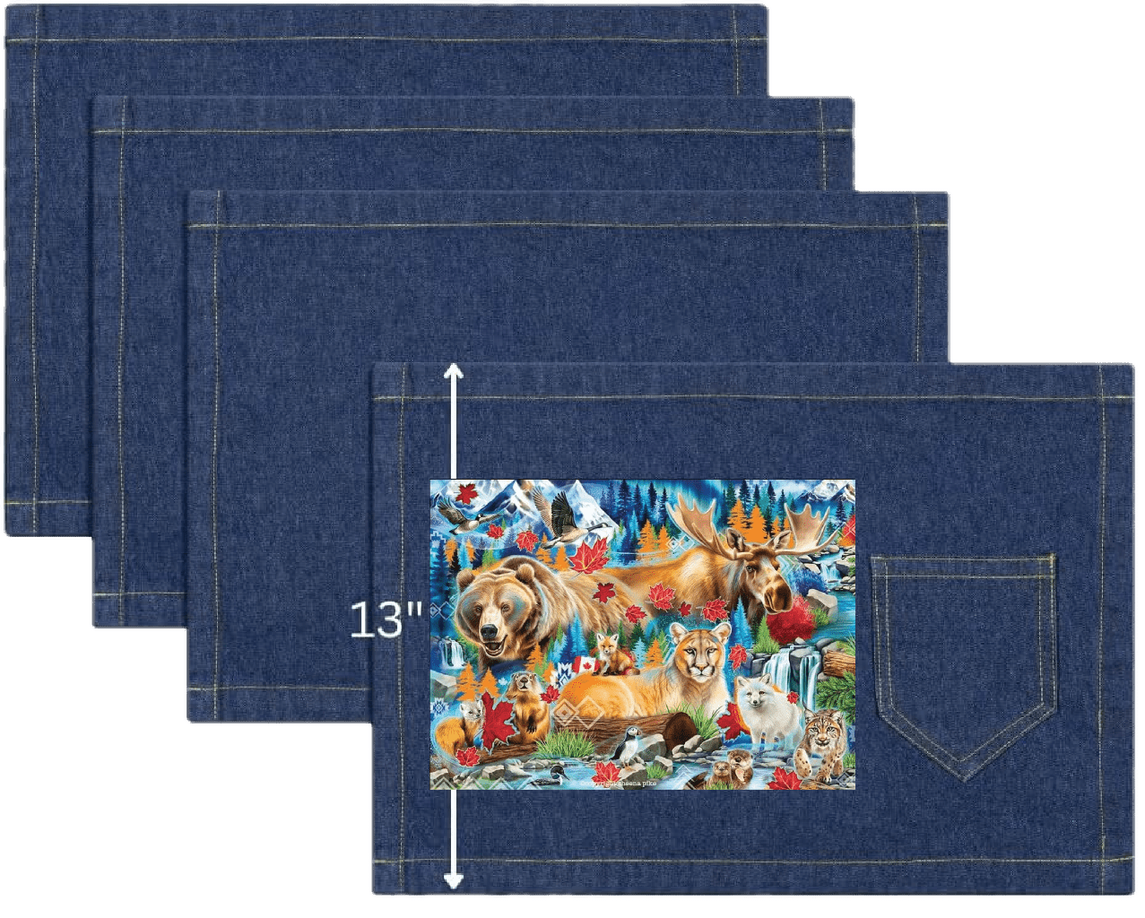 On white denim, clarity and vibrancy take hold. Blues brighten, rivers and waterfalls regain their sparkle, and individual animals separate more distinctly from one another. The moose’s antlers read sharply, the cougar’s musculature becomes more defined, and the bear’s fur texture stands out clearly.