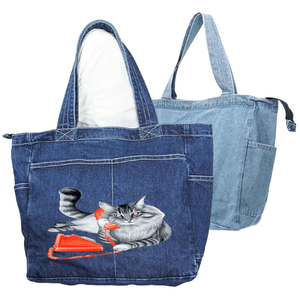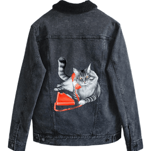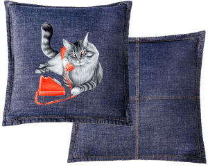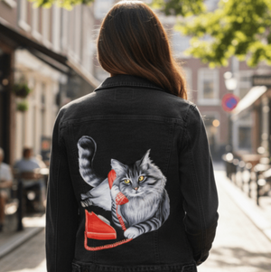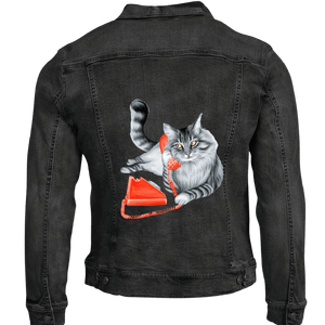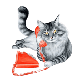 illustration of a fluffy gray long-haired cat reclining with its tail curled upward, holding a bright red vintage telephone receiver to its ear. the cat’s fur is rendered in layered charcoal and silver tones with fine whisker lines and golden-yellow eyes gazing forward. a matching red phone base and coiled cord rest below. this artwork is titled “Cat on the Phone” and created by Amélie Legault