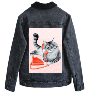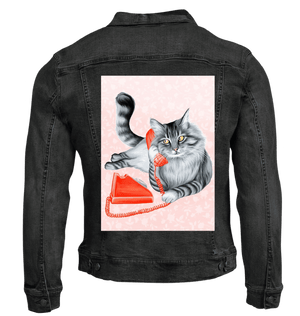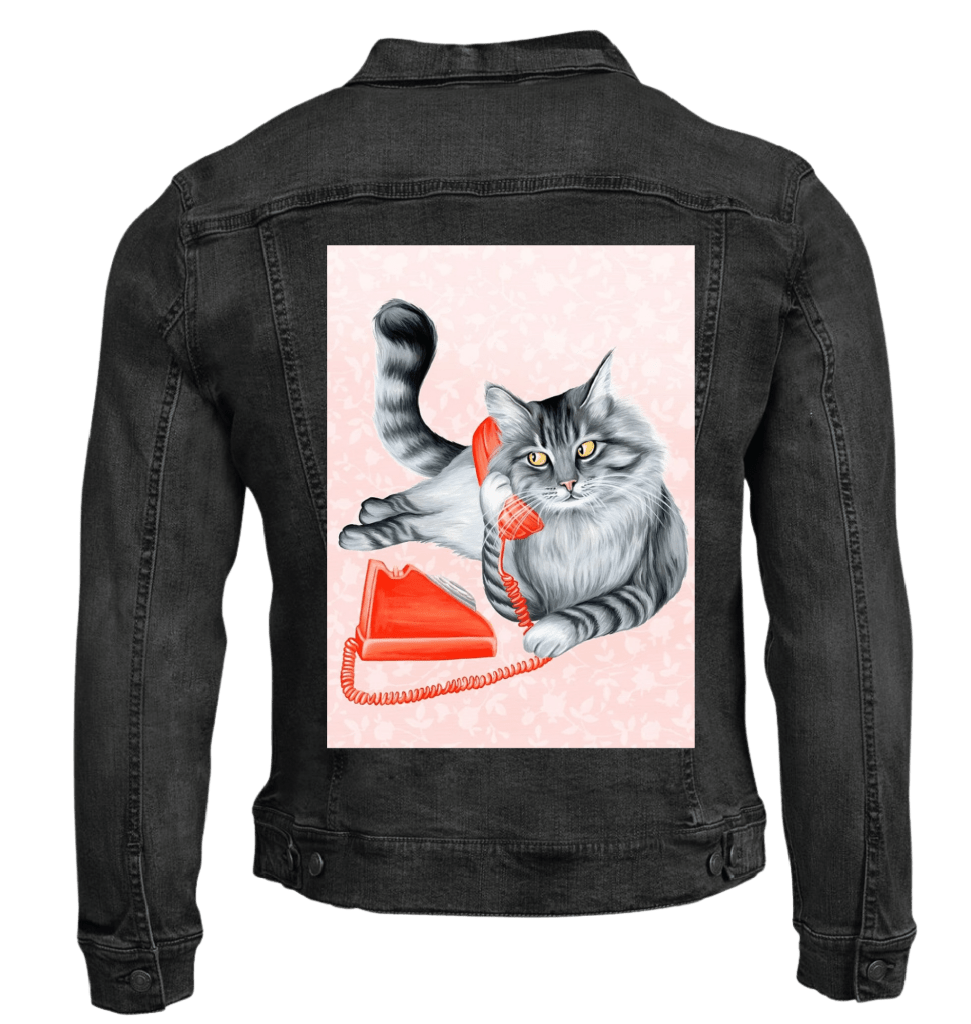 The red telephone on black denim becomes the