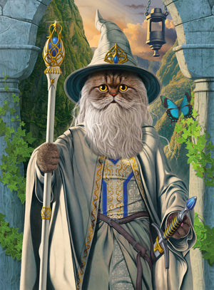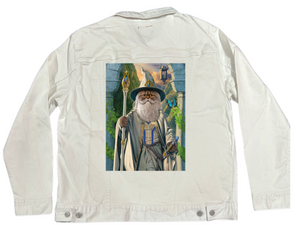 CATDALF THE WHITE by VINCENT HIE, digitally printed on a hand-made Denim Jacket with 3 color choices: Stonewash, White, or Black. Unisex XS S M L XL 2X 3X