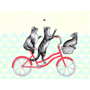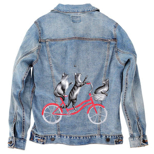 CATS RIDING A BICYCLE by Amelie Legault,digitally printed on a hand-made Denim Jacket with 3 color choices: Stonewash, White, or Black. Unisex XS S M L XL 2X 3X