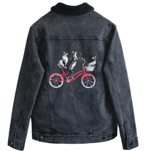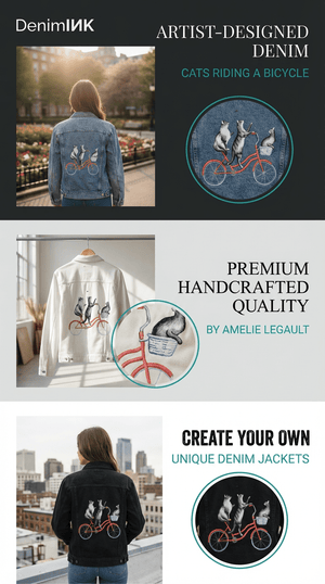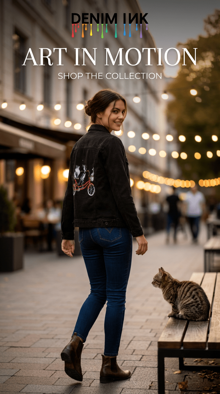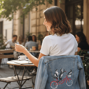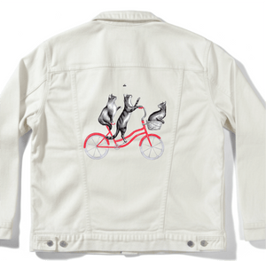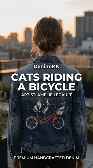 The red bicycle on black denim becomes the emotional anchor, glowing vividly as it cuts through the darkness. The wheels feel heavier, more grounded, while the cats appear almost suspended above them. As the jacket bends and folds, flashes of red emerge and disappear, like motion glimpsed at dusk. The moment feels intimate and cinematic — a quiet ride shared, curiosity intact, balance held without effort.