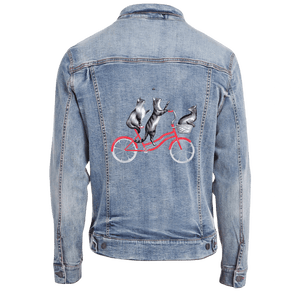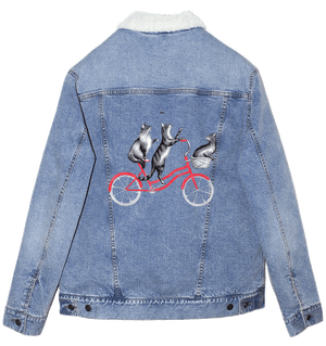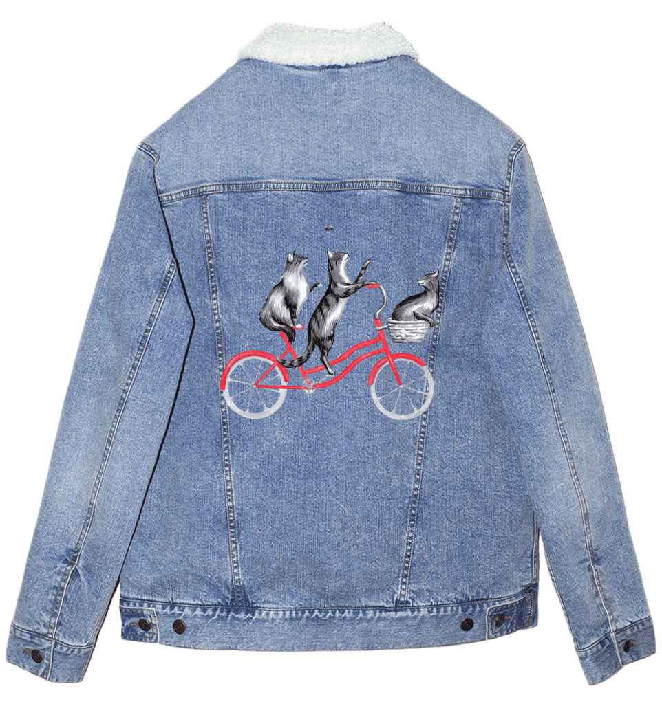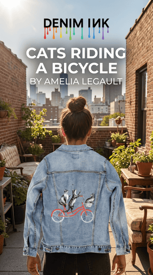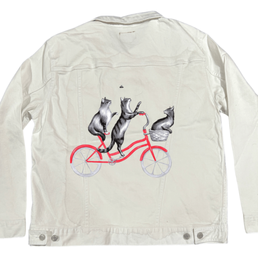 On stonewashed denim, the cats’ fur softens as pigment settles into the weave, especially along the layered strokes of the central cat’s torso. The darker spine line diffuses slightly, making the upward stretch feel gentler and more relaxed. As the jacket moves, light breaks unevenly across the softened fur, giving the cats a sense of shared motion — like riding together through air that moves slowly around them. The background triangles blur further, becoming texture rather than pattern, reinforcing the dreamlike ease of the scene.
