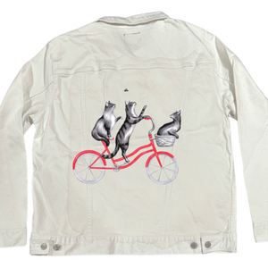 The red bicycle on white denim becomes crisp and graphic, its curves clearly defined against the bright base. The geometric background reads brighter and more playful here, adding lift and energy. As the jacket moves, contrast remains steady, giving the artwork a buoyant, cheerful presence — motion that feels joyful rather than urgent.