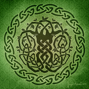 leaf shapes and flowing Celtic motifs are woven throughout the branches and
